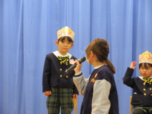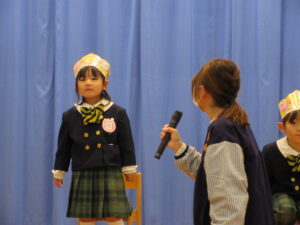 お友だちやお家の方の前で、インタビューに元気に